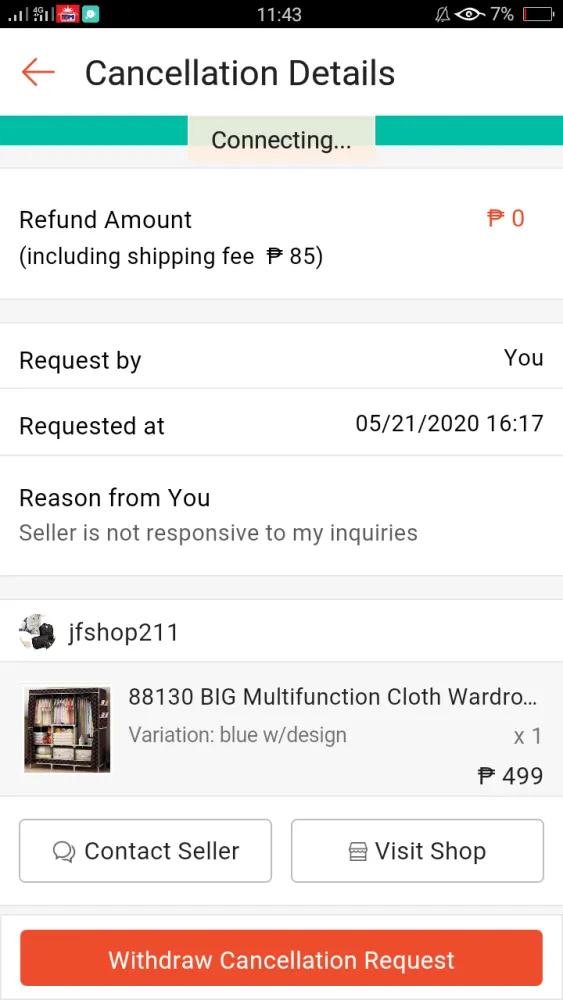 Cancelled my order last May 6th and was approved by seller the same dat. according to their help center, orders thru credit card will be refunded within 5-7 business days. Today, May 17th (7 business days after cancellation) I still haven't received any updates yet so I decided to contact their CS thru chat. The agent's name is Blessed and it was the most frustrating conversation I've ever had in my life. I pointed out what I have read from their help site (https://help.shopee.ph/ph/s/article/How-to-get-refund-for-Credit-Card-Debit-Card-1542963158805)