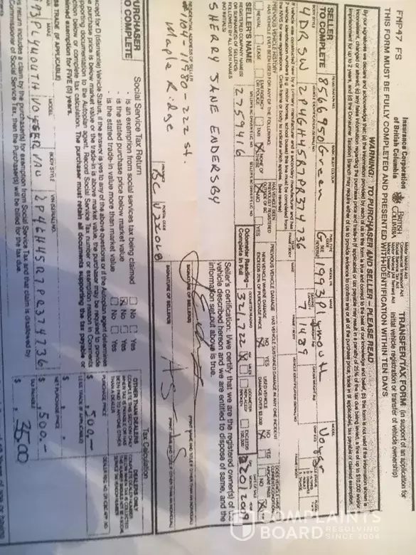 6) Got phones callsderom Veterans affair(s) Ottawa and Penticton, ICBC, Canada Revenue Agency J & R Insurance Burnaby the overseers of the Insurance company who are lodging complaints and told me to call J & R Insurance Stamped per forged Veh Transfer Branch 44062 in Burnaby This is nopt far from 4500 Baxter Placein Burnaby 11.5 km from where Bruce use to work "Initials are BD" as the person at J & R who processed this ... he told me all about it during a phone call