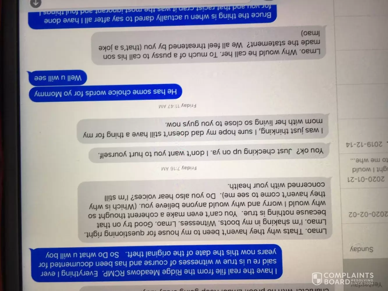 History 2016 or 2017) of my having to report Bruce'ssister in law for threatening to hit me with a "bat" Penticton RCMP –f emale officer attended me Attended by Penticton female officer Showed her the texts and she was going attend the residence of Sam Nelson GF of Martyn Tarras – Bruce’s brother – Martyn called in anger after that