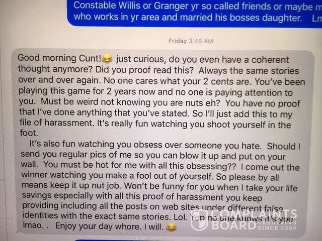 Bruce Tarras Chilliwack texted this on his cell phone .. all day long in fact 604-614-4282ADT employee starting at 3:45 am on Feb 20 2019 and finally ending after multiple callsthroughout the day until 4:43 pm.. Initial calls started December 05,2019 from telephone number [protected] 7:22 pm and ending upsending some rather scandalous texts all the way trough to 4:43 pmFebruary 21 2020. ADT has a criminal on their payroll out of the Burnaby, B. C.Canada office. I think they should do something about it. Partial Call Log:Dec 05, [protected] 7:22pm .. call blocked..not answeredDec 05, [protected]:23 pm ..call blocked ..not answeredJan 21, [protected]:16 am .. call blocked ..not answeredJan 21, [protected]:09 am .. call blocked ..not answeredJan 25, [protected]:22 pm ..call blocked .. not answeredJan 27, [protected]:22 am .. call blocked .. not answered again at my end as this number hadbeen blocked for yearsFeb 1. [protected] 1:00 pm..call blocked ..not answered ..blocked again at my endFeb 1, [protected]:00 pm .. call blocked by me again and not answered ..number had been blockedfor years and he has still kept calling me.Feb 19, [protected]:08 am .. call blocked at me end by me and not answered .. still inboundcallingThursday February20, [protected] cell phone used this time at 4:30 am in order toget past my call block .. short text received .. not too niceFriday February21, 2020 1:01 am multiple texts got through and woke me up 604-614-4282cell phone used this time again … 16 total messenger texts in from BruceW. Tarras cell phone number from 1:01 am in the morning and progressingthroughout the day until 4:40 pm on this Friday … texts were someshort and some longer longests was 18 lines of text on messenger.. wh has timefor this when they are working?Thank you for youremail Sherry.Kindly contact the Ridge-Meadows RCMPDetachment at [protected] and choose option 1 to contact a Report Taker. Welook forward to hearing from you are your earliest convenience.Respectfully, Ridge-Meadows RCMPDetachmentDetachment deRidge-Meadows [protected]