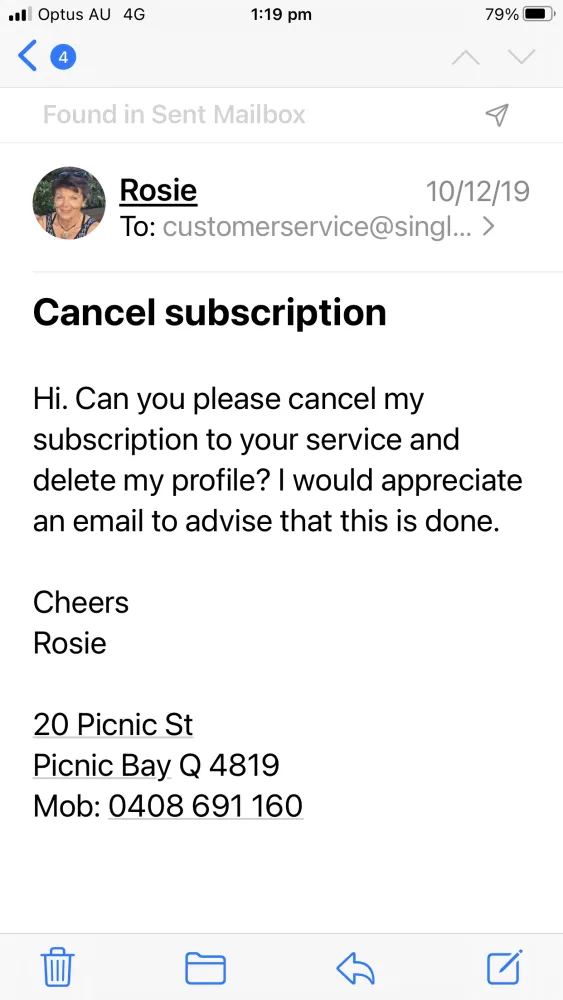 I contacted Singles50 by email, as I don't have access to fax, on 10/12/19 to request the cancellation of my membership to their dating site. I recently discovered that since then, the amounts of $299.40 has been removed from my account on 30/3/2020, 30/9/2020 and 30/3/2021 without my consent. I expect the sum of $898.20 to be reimbursed into my account promptly.