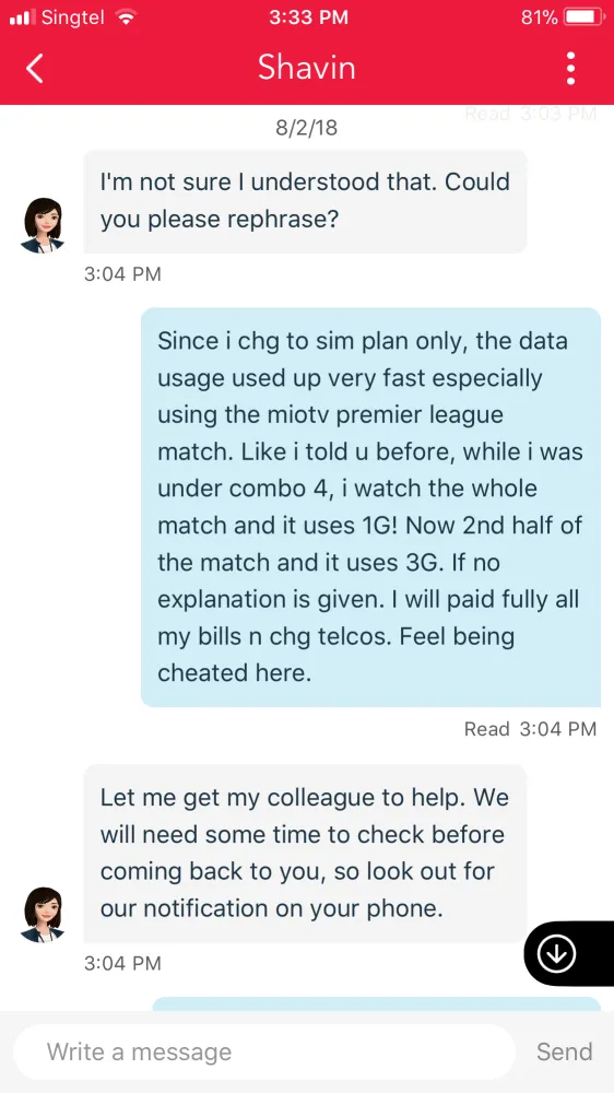 It's funny. I mentioned to a colleague at work yesterday that I was going to Singtel today to discuss this and he asked me why I belong to Singtel. He said their customer service is terrible. He is a customer of a competitor and told me they have great customer service. I assured him I didn't have any issues with Singtel. That is until today. I am canceling my service and going to a competitor. And, as is easily done today, I will be sharing my incident on social media so that quickly several hundred potential or existing Singtel customers see what they can expect from your company and its employees.