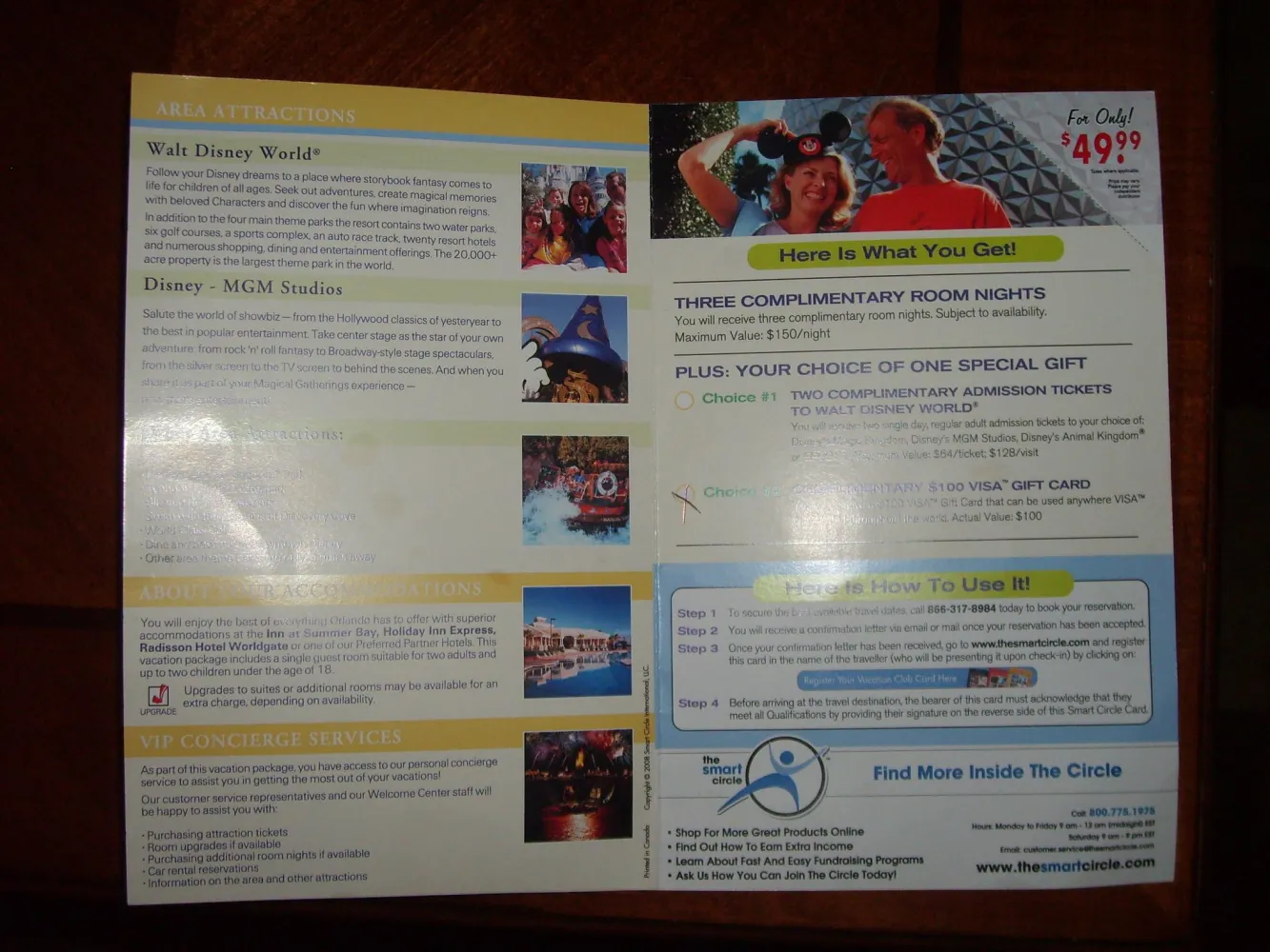 I purchased a vacation package from The smart Circle and was told I could stay at any Disney Resort of my choice I just had to make sure there was availabilty an to make a rsvp at least 30 days prior. And when I called (they ) smart circle said I did not have a choice of where I was gonna stay and they could not tell me I had to wait for an email or letter with a conformation and It would take up to 7 days and said I had to pay the $15.00 a night tax on the room right then on the phone or I could not get it. I had already paid $49.99 for the package so I went ahead and paid the $45.00 and it's now going on 2 weeks and I have not received any emails or letter in the mail. I have no way of getting ahold of them and when I try to call Smart Circle I can't get anyone on the phone. And also I was told when I called to to book the room that I would have to go to a welcome center first (the day Im due to check in) an they the welcome center will tell me where Im gonna stay for the weekend and then give me the voucher for the hotel they pick which would be a Holiday Inn express or something similar. And it would be atleast 6 miles from Disney and they would make arrangements to take us to the timeshare and do the tour for 90 mins. I am so disappointed at how this company keeps you in the dark on where your gonna stay an how they turn everything around but take your money right away. I do not like the fact that I have to waste my time driving to Orlando pay for gas and have no idea on where Im gonna stay until I go to the Welcome Center at which I have no idea where that is until they email me. Save your money an dont waste your time to much of a hassle. I'm gonna try an get my money back.)