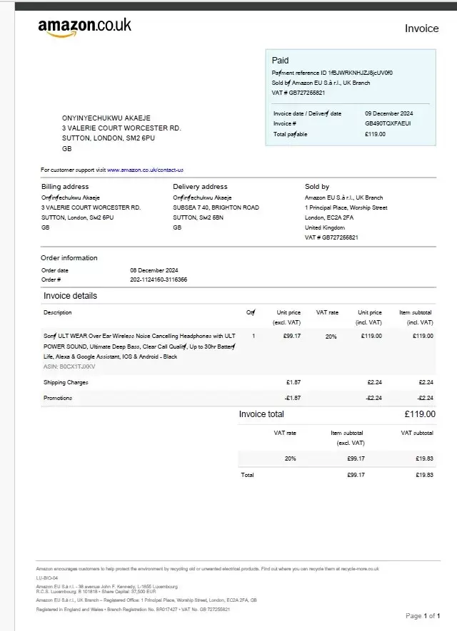 To whom it may concern, I am writing to formally escalate an unresolved and deeply concerning after-sales service experience involving a Sony product that was confirmed to be under warranty at the time of first contact. The product in question is a pair of Sony ULT Wear Over Ear Wireless Noise Canceling Headphones (WH ULT900N), purchased from Amazon UK on 9...