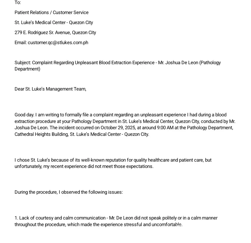 Mark Cristopher Siblag Road 13 Nagtinig Taytay, Rizal Mackysiblag.[protected]@gmail.com [protected] Date: October 29, 2025 To: Patient Relations / Customer Service St. Luke’s Medical Center - Quezon City 279 E. Rodriguez Sr. Avenue, Quezon City Email: customer.[protected]@stlukes.com.ph Subject: Complaint Regarding Unpleasant Blood Extraction Experience - Mr. Joshua...