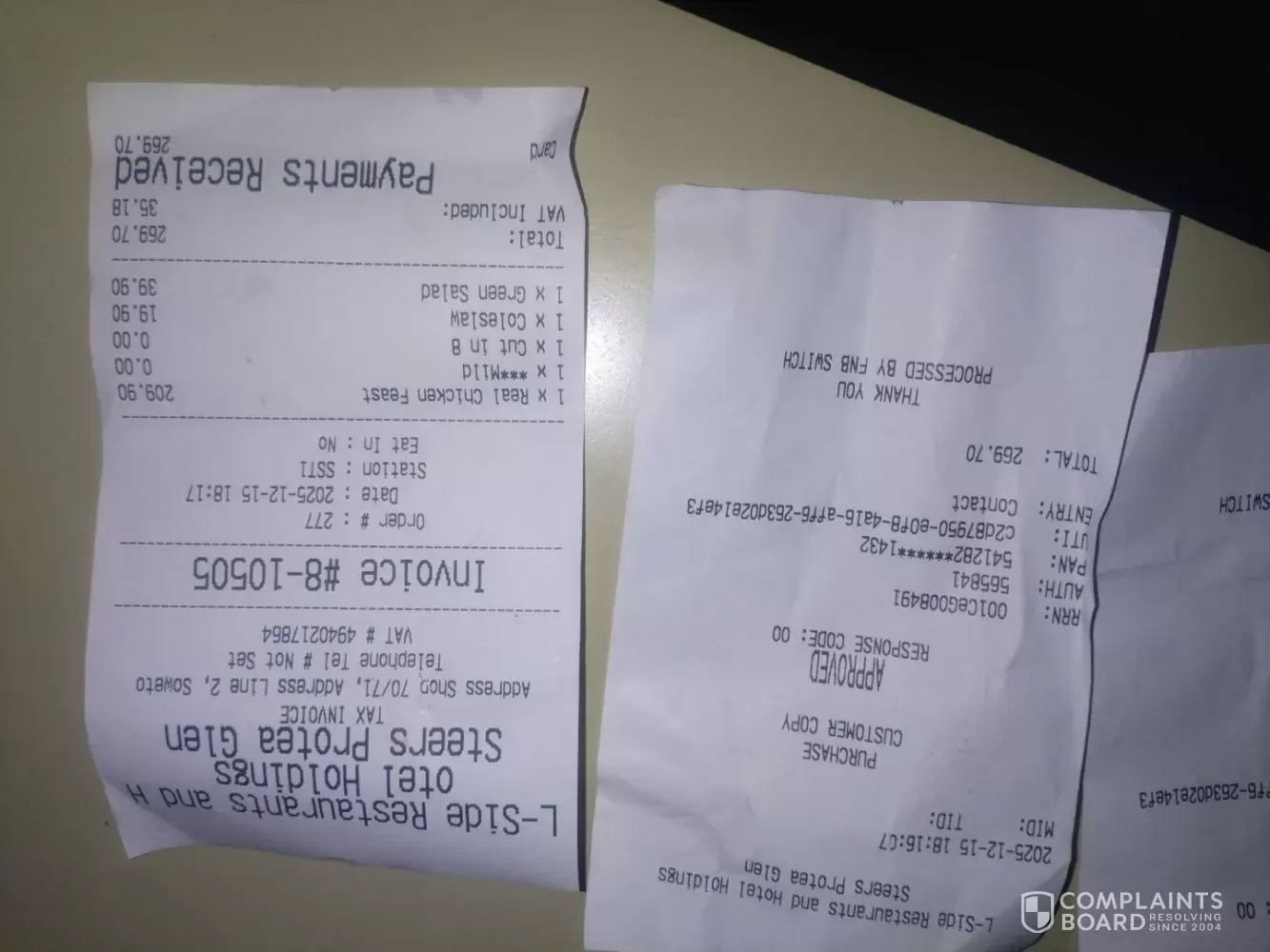 I am writing to lodge a serious complaint regarding my experience at your Steers Protea Glen outlet on [date, 2025-12-15], where I placed order #8-1056 at 18:17 for a Real Chicken Feast (full chicken, coleslaw, and green salad) with invoice total R269.70.