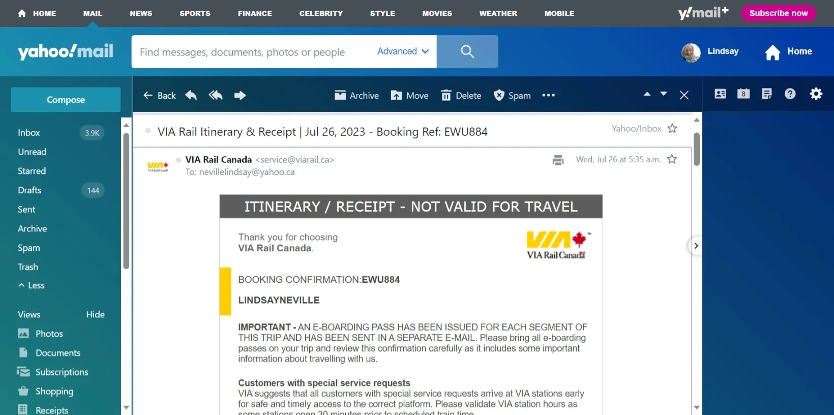 I originally had a trained book from Toronto to Ottawa at approx. 5 am, but had to cancel and rebook a train, which incurred extra costs. The cost of the new train tickets were 284$