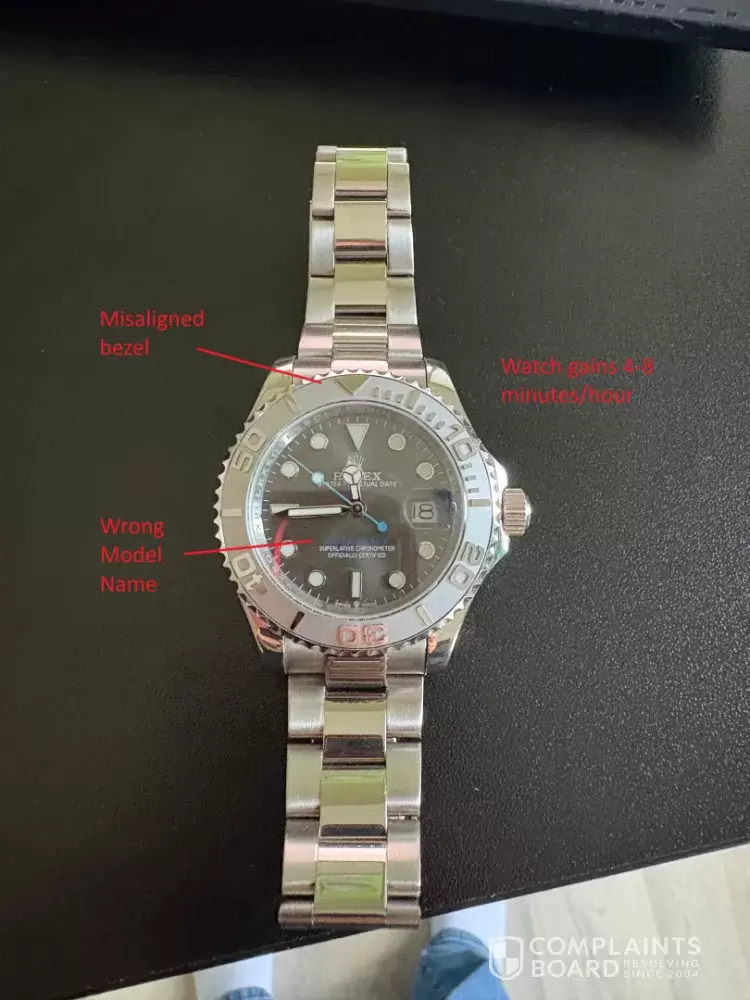 The replica watch I received doesn't keep time (gains 4-8 minutes/hour), has a bezel misaligned, and has the wrong model name on the front of the dial. I contacted the intermediate sales person, who claimed to have in turn contacted the factory to request a replacement on my behalf, but then the stopped communicating with me.