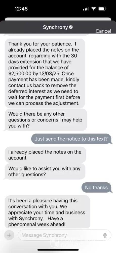 Synchrony customer is a ghost, and provides zero to none is ability to contact the bank and address issues. They applied deferred interest to military during the government shutdown, agreed to extend deferment period, and if paid off to remove applied interest. Now they are impossible to get a hold of to clear and close account.
