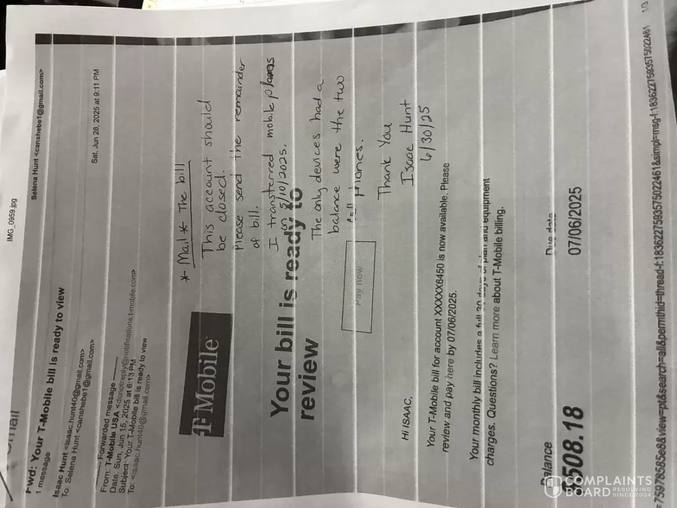 I switched over to AT and T on May 10th of 2025. I contacted T Mobile to cancel all services. I paid off both watches on 5/10/2025. $206.24 from Truist account and $206.24 on my Navy Federal account. I had a EIP balance of $1267.67 as of 2025 which was the balance for the phones. On 5/12/2025 an amount of 326.57 was paid, On 6/30/2025, I paid $508.18 which was for the phones only. On 9/6/2025 I paid 601.64. Everything else was paid off. Somehow T _mobile has been charging me for 4 voices and 4 -wearables. I've only had two voices and two watches. The other two lines were tablets which were paid for as well. I had my wife suspend those lines because the tablets did not work -with apple phones. The phones I traded in to AT and T were under the [protected] number which was the IPHONE 15. The IPHONE Pro was under [protected]. However, they are billing us under the extra lines and tied the phones to those lines. They tied the [protected] number to Portable power box which was also paid for. That should not have a phone number. The phone numbers they are charging for now where not voices used or wearables. Those voices were extra lines and the two wearables as they claim are two tablets that were paid for. I am wondering if this is a practice they used to trump up charges on customers. That is the reason I left them because of all those lines and attaching the lines to different items on paper. If they do research, they will know that we never had 4 phones so why would you think I owe you a balance. I sent two certified mails and all receipts.
