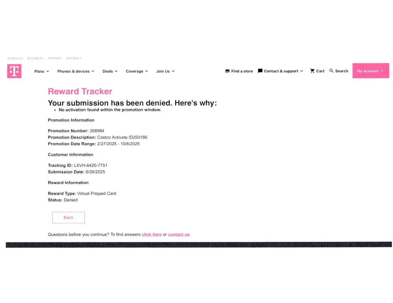 • On 10/24/25, I checked the promotions page and found that the 2nd submission was denied because “No activation found within the promotion window”.