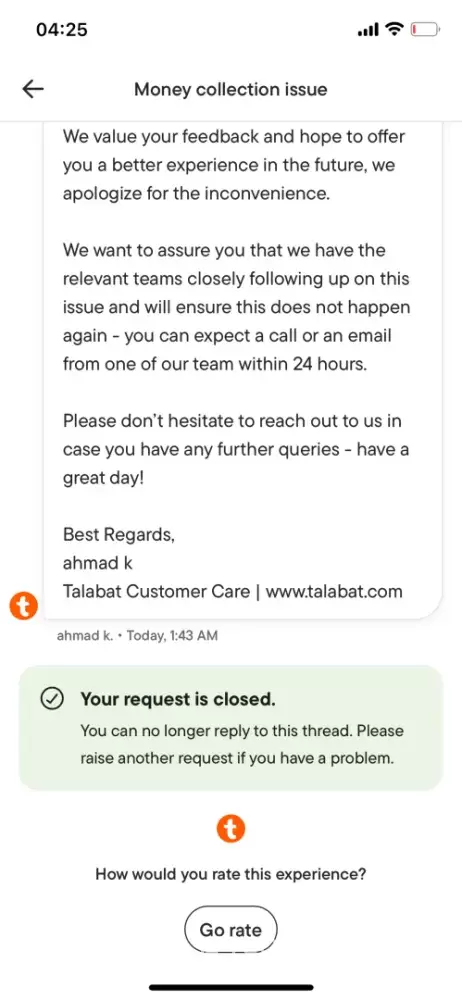 I want to report that talabat rider in Bahrain took the money to change it only to ended up to steal the money. I repeatedly contacted the talabat service and they don’t provide any help so far. They only keep asking me to wait till they resolve the issue but I clearly don’t see any action from their team. I simply asking to return my own money but turned out they can’t or don’t want to do it. Otherwise why would they keep saying that someone will contact me in a short time but no one ever did, unless I contacted them myself. And one more thing on my complaint they already closed the case without resolving my issue
