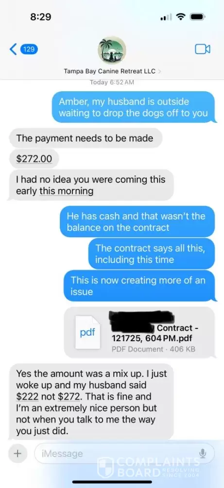 I booked boarding for my two dogs with Tampa Bay Canine Retreat LLC and paid a deposit to reserve specific dates. Our contract listed a 6:30 AM drop‑off time. My husband arrived at that time, but no one answered the door. I contacted the business at 6:48 AM, and they did not respond until 7:00 AM. Their first message referenced an incorrect balance, and no...