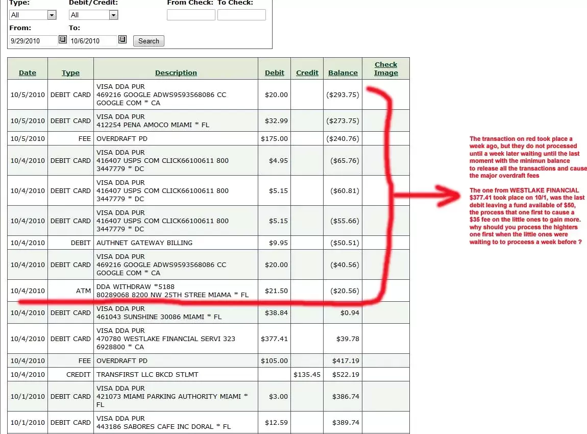 This has to be illegal guys. Let me explain what they did to me. In the last three weeks they have taken 605.00 in overdraft fees from me. I put in a deposit on a Saturday which will clear on Tuesday. I watch my balance closely. We have been struggling for so long that when the money is deposited I have to get a few things. They give you 100.00 from the deposit immediately. So I build up like 10 small purchases but they are covered with my balance that is in there plus the 100.00 they give you immediately. Then a transaction comes in and is cleared on Tuesday when I was told my deposit will clear first thing Tuesday morning. So I say to myself, "Well we needed to get fuel to run our dump truck so I will take the 35.00 overdrawn fee instead of losing 700.00 for losing the truck running for the day if it clears before the check clears. I know this was wrong to do but we had to run the truck. Well, they take that big charge of 150.00 and put it in front of all the little charges I made that were covered with the money I had in there and therefore I get the overdraft fee for the fuel which I expected but also the 10 tiny charges that were covered, are now in front of the 150.00 fuel charge instead of behind it where they should be. I understand they are all in the pending stage but I don't see how they can legally take another pending charge and put it in front of all the other pending charges even if they were in the pending stages three days before the new charge! I hope I explained this to the point where you can understand. I am so angry it's hard to explain it lol. Instead of keeping the pending charges in order as they come in, they will take the largest pending charge and jumble the other charges so they can make loads of money. I could have paid off a charge in one payment with the money they took from us. Plus finally after struggling for over a year, to see that kind of money just go like that makes me sick. The thing that gets me the most is when I looked at my balance and transactions this morning all was fine, no negative, the check cleared and everything was in the plus. Then two hours later I look into my pending transactions and there was the 170.00 overdraft fees listed. Glad I held off and didn't pay any more bills before they snuck that in there.