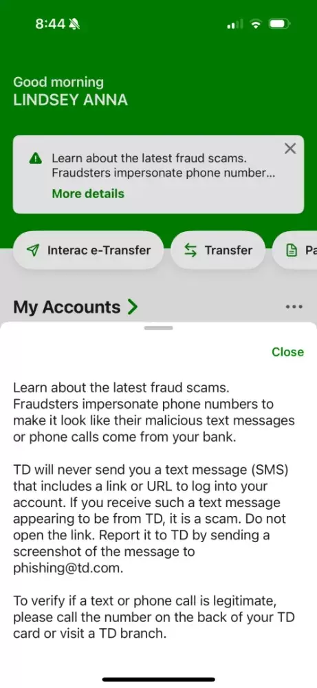 I strongly recommended, numerous times, that if TD needs to notify customers of these scams, via website main page, and easyweb login, so that it is mandatory viewing, which they only started doing on December 17th 2025 (see screenshot).