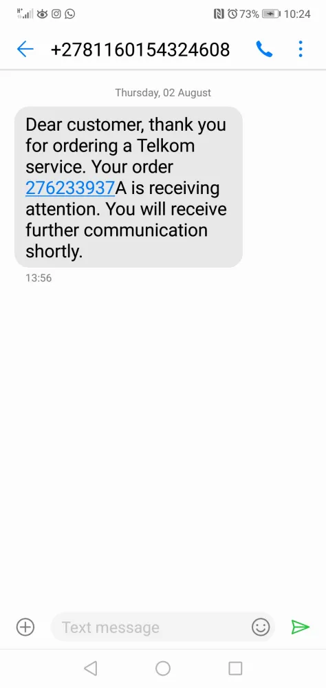 I visited your Telkom Branch in Canal Walk on 25/08/2018 and signed up for the ADSL 10mb line. I was informed it will take 7 to 21 days for installation. ONE MONTH LATER we called telkom and the TICKET HAS BEEN CLOSED! how and why? we received a call on the 5/9/2018 telling us a technician would out on 7/9/2018 t but to date NO ONE CAME OUT. When I called your contact centre on 25/09/2018 I was informed my ticket is closed and marked completed! I have been with Telkom for 2 years with my LTE contract and till this point have never had an issue with Telkom . This is very unprofessional can Telkom please inform me when my issue will be resolved or will I have to wait another MONTH. I also received a sms informing me that i will be BILLED for this month. FOR WHAT, WHEN I STILL DONT HAVE INTERNET INSTALLED! lastly why are we as TELKOM CUSTOMERS not getting informed we have no idea what is happening. Someone also contacted me from the survey department and then said they dont know what is happening its like NO ONE IN TELKOM knows what the other departments are doing! INCIDENT NUMBER 3654306
