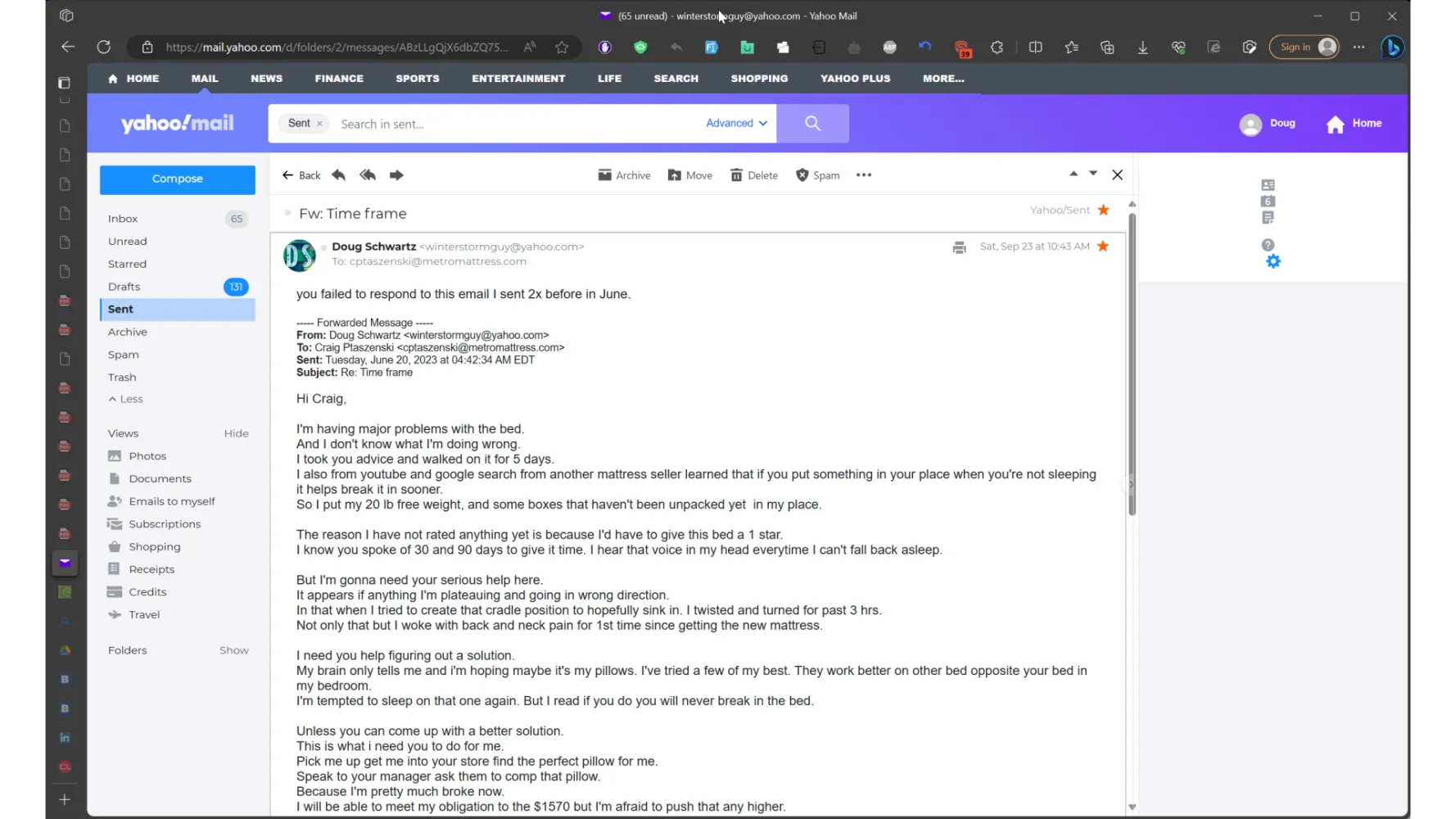 I ASKED HIM BY EMAIL ON THE 11TH AND 13TH DAY IF HE COULD NOT HELP ME WITH THE NIGHTMARE OF NOT BEING ABLE TO SLEEP, THAT I WISH HIM TO PICK UP MY BED AND RETURN IT AT ONCE. HE NEVER RESPONDED.