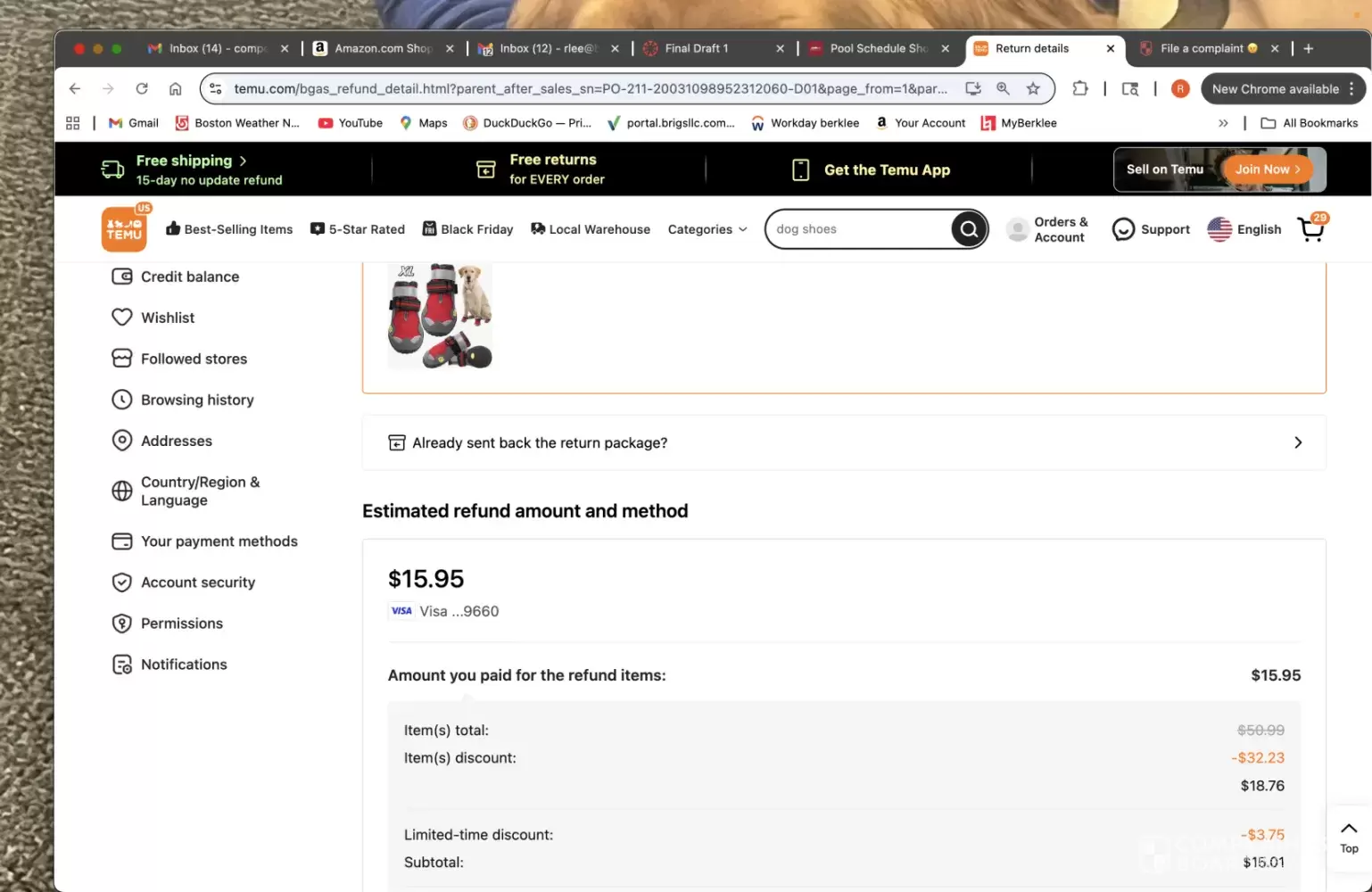 The return for a refund needs to be processed. Temu issued a total refund for the item was $15.95 which was not what I paid for original.