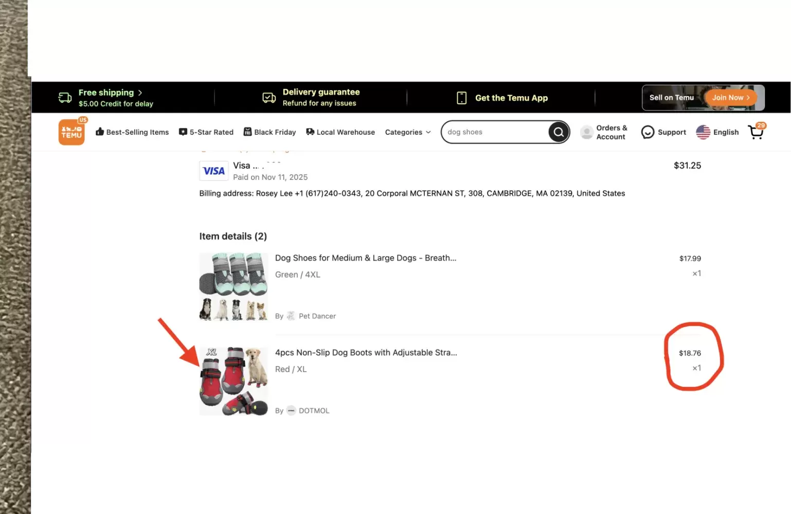 I paid the dog shoes for $18.75 on 11/11/2025 and received on 11/19/2025. The shoes didn't fit even though based on the size chart and description.