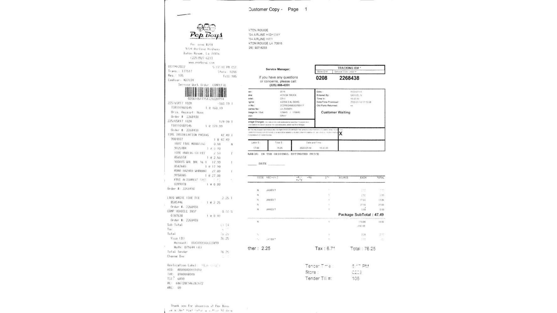 I have spent a total of $6,086.73 getting my suspension repaired at your 345 4th Ave, Brooklyn facility. On 12/8/21, I brought my 2014 Cadillac to your 4th Avenue, Brooklyn facility indicating a sound emanating when I brake or depress the accelerator. After a $3,064.55 repair bill the issue was not resolved. Recently my ABS and traction Control lights highlighted on the dash. I took the car to Cadillac and during examination, he discovered that PEP Boys, according to the Cadillac Technician, in writing states PEP Boys “left front wheel speed harness and convector damage. Right front suspension harness from strut damage due to suspension repair at PEP Boys”.