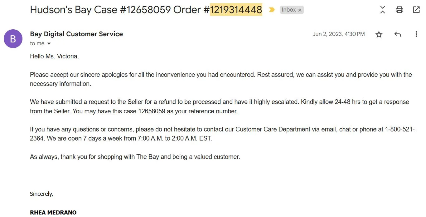 I never received a refund despite numerous calls to The Bay customer service.