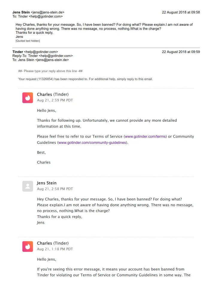 Upon request on 21 August to "[protected]@gotinder.com" a Charles informed me of the following: