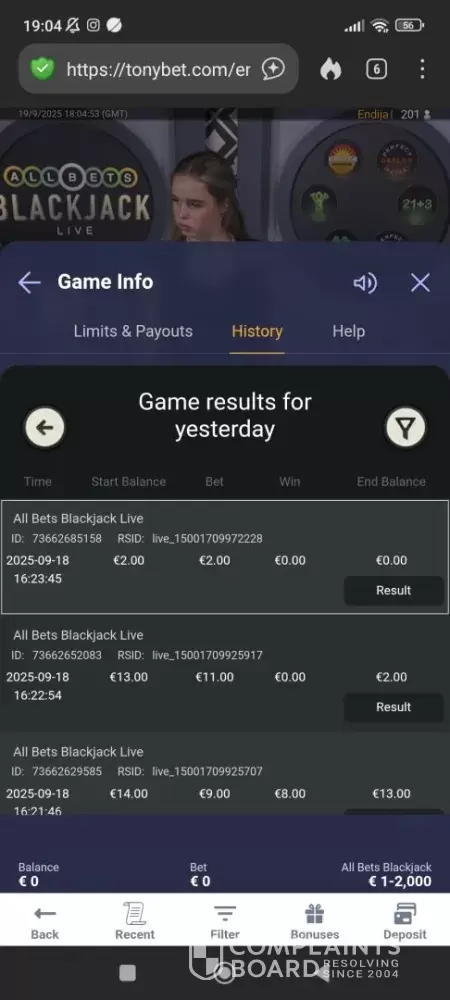 - While TonyBet has a high level of trust, our investigation has revealed that the company's complaint resolution process is inadequate and ineffective. As a result, only 0% of 12 complaints are resolved. The support team may have poor customer service skills, lack of training, or not be well-equipped to handle customer complaints.