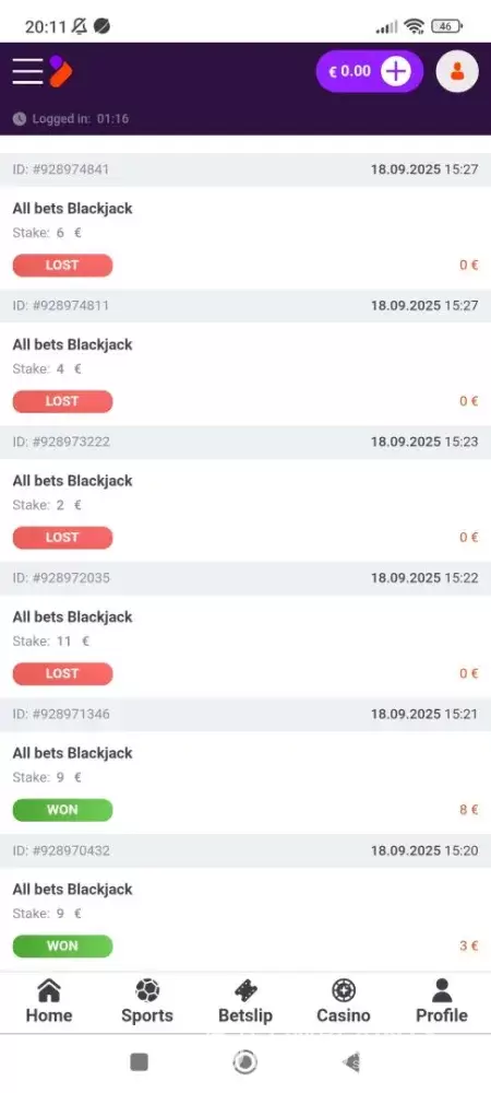 Deposited 10 euro to play - allbets BJ. Placed 4 euro bet, it said bet not confirmed, but took the 4, I exited allbets to go to the main app screen and my balance had gone to zero. Checked the game history on all bets (see screenshot) no games after I had deposited, yet when I logged on to the main website it showed two games after that for 4 and 6 euro...
