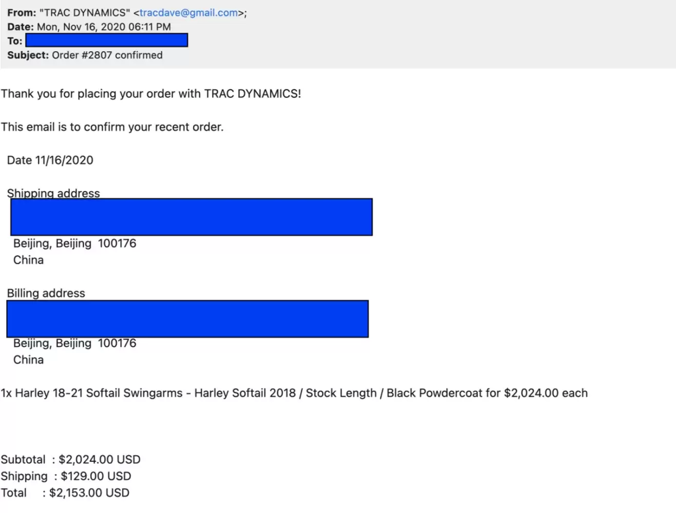Non-delivery or refund of motorcycle swingarm order in Nov 2020, which was paid in full 2153 usd via credit card. My order number is 2807, within in 5 years, I try to reach them for money time, but still no any answer to me. I am live in China, all Harley parts bought from US, since I like Harley and trust US made Harley parts, I bought a lot from different company and website, this is the only company doing business like that. I couldn't believe they are doing a Business Fraud. The only meassge I got was from their website "chat with us", said my email and order number was provided wrong, ironically the only email I got from them with order number is the same email. I just want my money back.