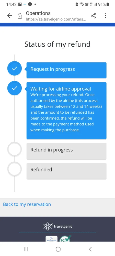 I proceeded requesting a refund from the website of travel genio. I never got a refund, Travelgenio is avoiding me completely, hanging up in my face when I ask what the status is, claiming it would take between 12-14 weeks, in the meantime it has been 6 months, and they keep giving me the excuse that they never got my money back from the airline, I called the airline, and they told me they never got a request for refund! More than that, they never got paid from Travelgenio!