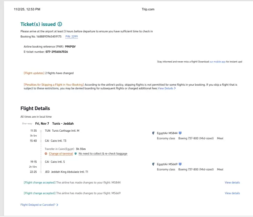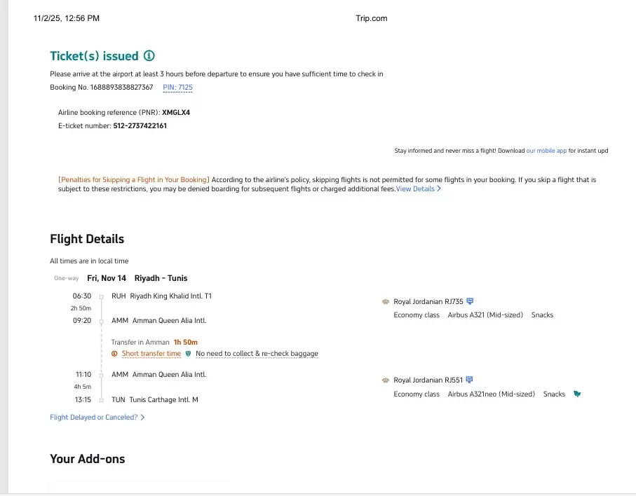 I am documenting Trip.com's egregious executive misconduct. They sold a flawed itinerary (Booking Ref: 1688893965459175 for November 7, 2025) that resulted in my DENIAL OF BOARDING and significant financial consequential losses (including missing insurance premiums and replacement flights).
