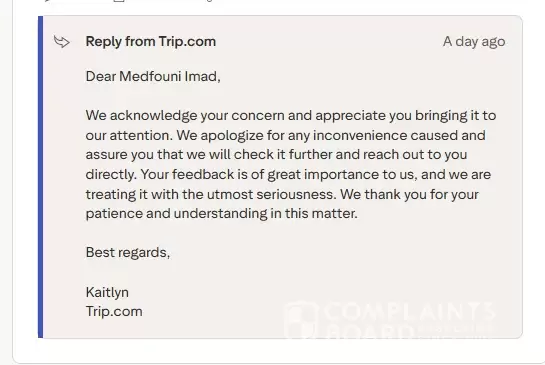 Following my complaints, Trip.com’s executive response team (under the names "Kaitlyn" or similar executive titles) publicly commented across multiple high-profile review platforms, making the identical, documented, and false promise to "reach out directly to resolve the issue."