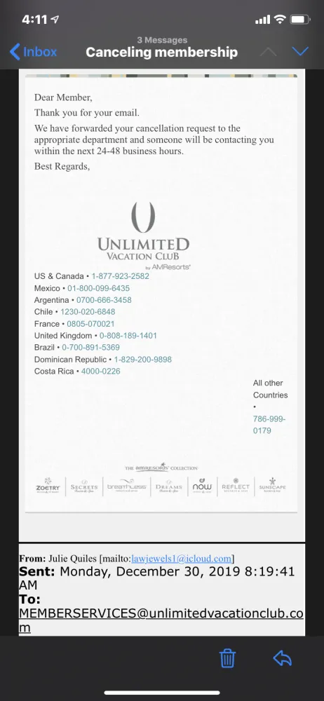 Sit I am happy to show everyone the 20 emails I have sent you since last Wednesday evening. You people do not respond. Yo are not going to tell anyone you have tried and couldn’t get a hold of me. I’m available. I just emailed you, at your provider address this morning again at 8:09 also last night at 6:15pm, yesterday at noon and yesterday morning at 8:15am. I can keep going on. Each email says I am available now and anytime along with a phone number and email address. If you can prove me to or anime here you tried to contact me in any fashion other than to collect money on a fake contract I’ll keep quiet. I am not in the wrong here, Unlimited vacation club is