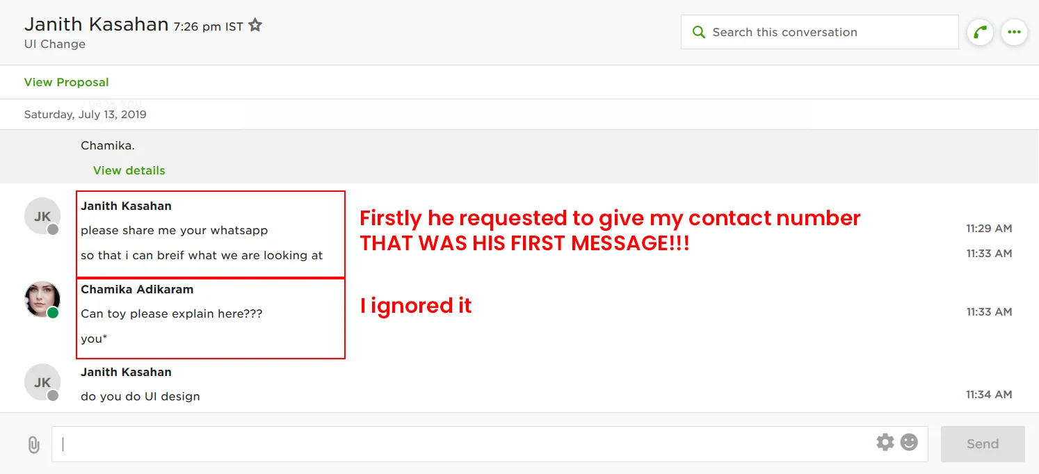 after that, I complained to the upwork about this issue and you guys suspended my worth account. I am a fresher to upwork and I beg you just kindly refer this matter and give my account back to me. I never ever beg this much if I did this purposely. But this is not my fault. That is why this much begging. I have attached all the screenshots regarding this issue. I am now in suicide mood. I cant earn at least 1 dollar. Even there is no chance to create any other account as well. My designs became just worthless for you guys. Why suspended my account because of another client.