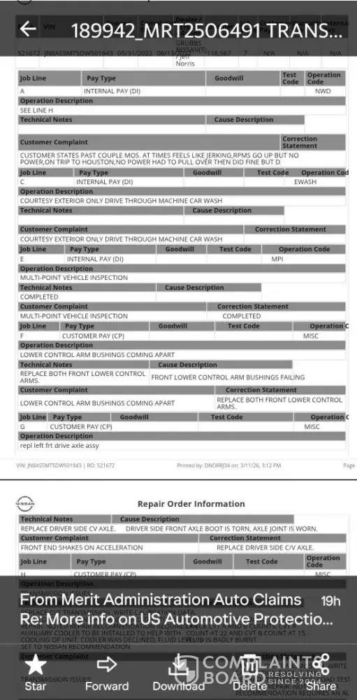 I got a contract( the deluxe plan which is the best plan,which was recently changed to a less valuable plan without my knowledge but the same price with US AUTOMOTIVE PROTECTION SERVICES in 2019. Monthly debits from my account ( 121 and change) . In May of 2022, my transmission went out. I called made a claim, had my car towed to grub's nissan in fort worth, texas.Which is now longhorn nissan. It seemed that everything was working smoothly. What I did didn't know is that they shipped in their own transmission.Without the cooler, which is a necessary item for the correct performance of the transmission.To keep it from overheating. ( I'll circle back to the cooler situation). Fast forward to March 2026. On my way home from work, I started to notice that my car would not accelerate. I remember this situation from my transmission issue in 2022. Once again, I made the call. Do US automotive protection services. Make my claim, call the towing company. They came and . picked up my vehicle just like they did.The first time. Now, the deception , accusations, lies, and dishonorin of my contract starts. I get an email that states that my claim is denied. Because the cooler was'declined by me. I call din to ask them. Why would I decline it cooler when my 100? Dollar deductible, what cover the cooler?And my transmission? They stated that was what the paperwork said. Keep in mind, they never called me about a cooler. Nor did I know anything about a cooler being needed. I spoke to numerous individuals who were rude and disrespectful and dismissive. Their names were john mike and andrew. I asked him. Who was the owner of the company or the CEO of the company? And they had no clue. Then, they asked me for receipts for brakes receipts for transmission fluid, and receipt from previous claims( we we'll circle back to this issue as well).I kept telling them that I didn't decline the cooler. I knew nothing about a cooler being needed. And I would have never declined it, because my deductible would cover that, along with the transmission continuously! Then, they proceeded to accuse Nissan of declining, a cooler, which is defamation. Because of nissan's business reputation. They also, defaintamed my character by lying on me and accusing me of declining. The cooler I have no signature of my name from them. No phone call nothing! Now, let's circle back to the paperwork. I recently, received an email from them, saying that they have no record of replacing my transmission.In 2022, while sending me paperwork from my transmission replacement by them in 2022, stating once again that I declined the cooler, which is a recommended necessary. Item, which was told to me by andrew in which I have transcribed documentation of him saying that! I renewed my contract with them in August 2024, unknowing that they were deceptive, initially by not adding the cooler to my transmission. The first time and I didn't know a company named ( MERIT) was involved with u s automotive protection services until I made the claim in march of this year. In the midst of me making my claim in March. I also made a claim about my axle and orlike but they never mentioned that. They were so focused on declining the transmission. Because they initially made the mistake with the first transmission. So they're trying to cover they're behind and accuse me and later accused nissan of declining.It. then, they accuse me of paying for the first transmission out of my own pocket, which makes no sense. Because why would I need the protection plan? If I paid for it out of pocket? So, now my mike's my car is still at the nissan dealership, they won't honor my contract now they're trying to get me to pay half on the axles. And the oil lake that is covered in my contract. Then, they tell me that I have seven months left.In order to pay off my full contract and that I will have two years free. What good. Does that do me right now to have 2 free years on my contract? When you will not honor the contract because of a mistake that you made in 2022 that you're trying to cover up and accuse me and nissan of doing in which we most definitely did not. But, there's still looking for their monthly payments from me. If you guys know of an attorney who deals with these kind of issues.Please contact me. My name is Johnny Croon. My number is: [protected]. My email address is: [protected]@yahoo.com. Thank you