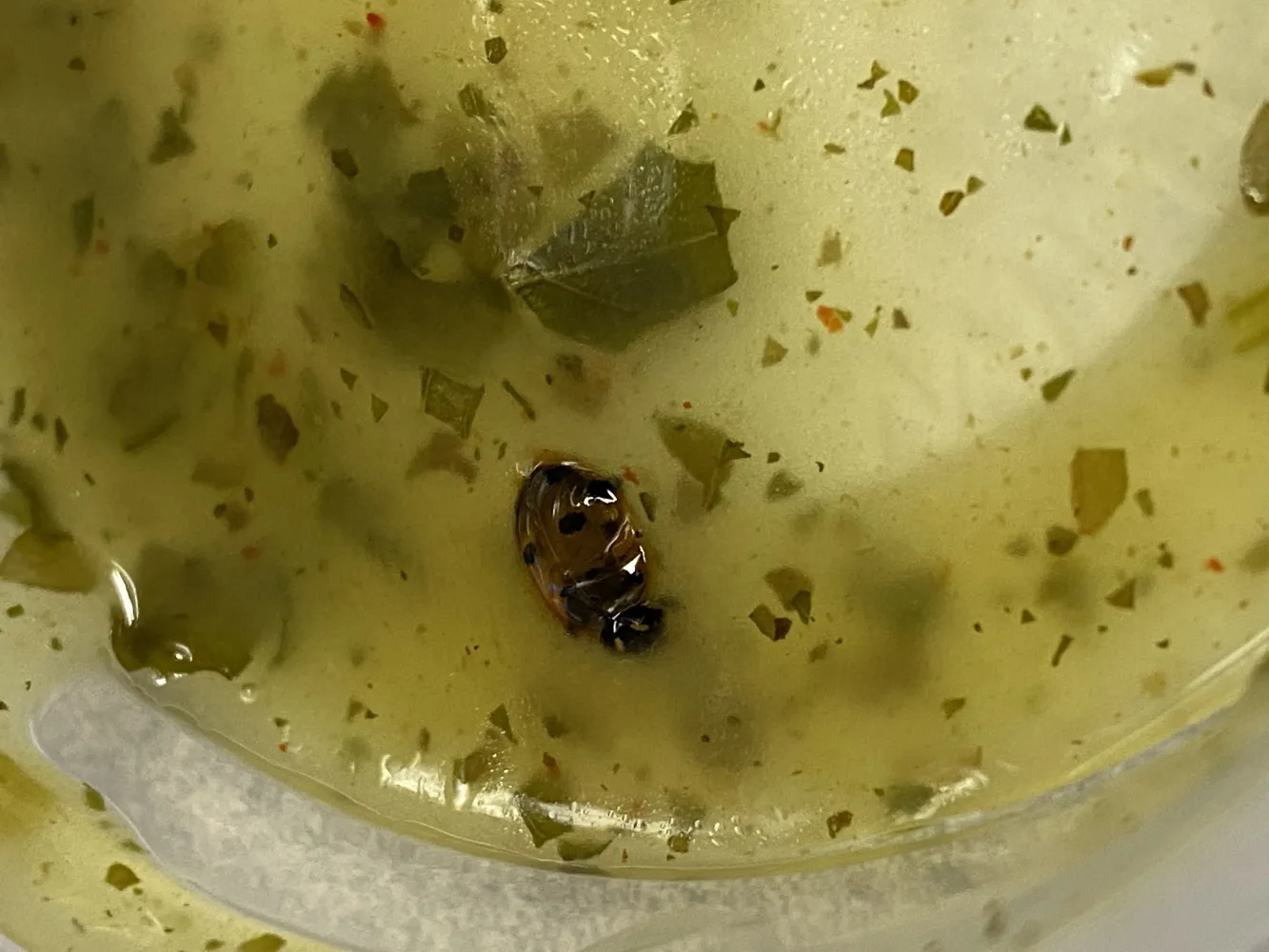As I was eating a pre-packaged salad that was bought from the veggie/produce aisle the night before (1/13/2020), I noticed there was a dead ladybug in the dressing container provided. I immediately threw out the rest, however I have already eating about 90% of the salad before seeing it.