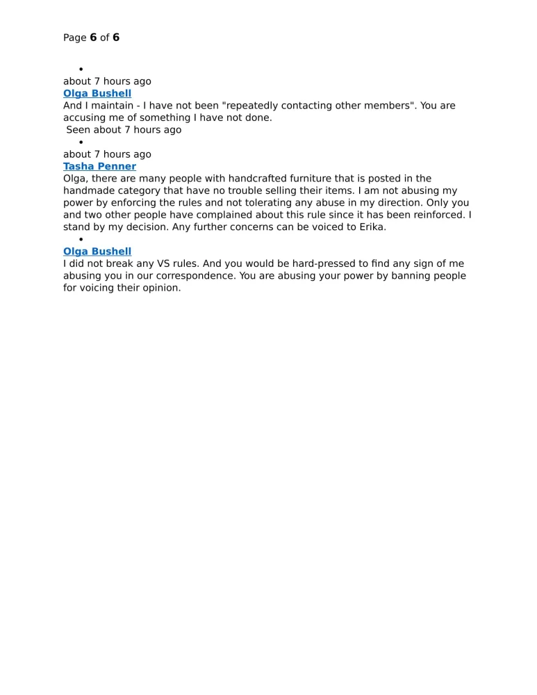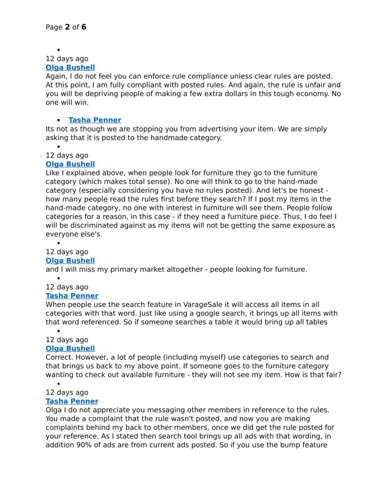 The incident happened on Mar 23. I feel my VarageSale membership revocation was unjustified and based on the admins's personal grudge against me. According to VS rules, "Community membership can be revoked when a member has broken one of that community's rules or, in some cases, if a member no longer meets the community membership criteria, such as requirements regarding location or account settings". Neither of those two things happened. I was fully compliant with the rules and code of conduct when I was banned. Here is the reason the admin gave for removing me: "This user's membership has been revoked for repeatedly contacting other members simply to complain about me as an admin and that I am continuing to ask members to post items in the appropriate categories". 1). I did NOT "repeatedly contact other members". I only contacted ONE person ONCE at when the rule was finally posted asking them what they thought of it to see if I was the only one not getting it (that person disagreed with the rule too, by the way, like a few others). I do not recall seeing a rule forbidding communication with other members, so I did not break any rules here either. 2). I did NOT complain about her as admin. I was only questioning the rule. 3). I did NOT complain about her continuing to post items in the appropriate categories. In fact, I was kind of glad to see I was not the only one she asked to do it. It is very sad that people who were given the power, abuse it. It does not give VarageSale a good reputation. It would take too long to describe the whole situation here, so I am attaching the full transcript of my correspondence with this admin. The only things I will add to help understand the situation as it is not covered in the transcript: I was selling furniture that I refinished, and it was originally posted in the Furniture category. Then the admin asked me to move it to the Handmade category (no rules regarding that were posted at that point). The rest is in the transcript. I am outraged with this abuse of power. I strongly urge you to look into it as such things should not be happening. Thank you in advance.