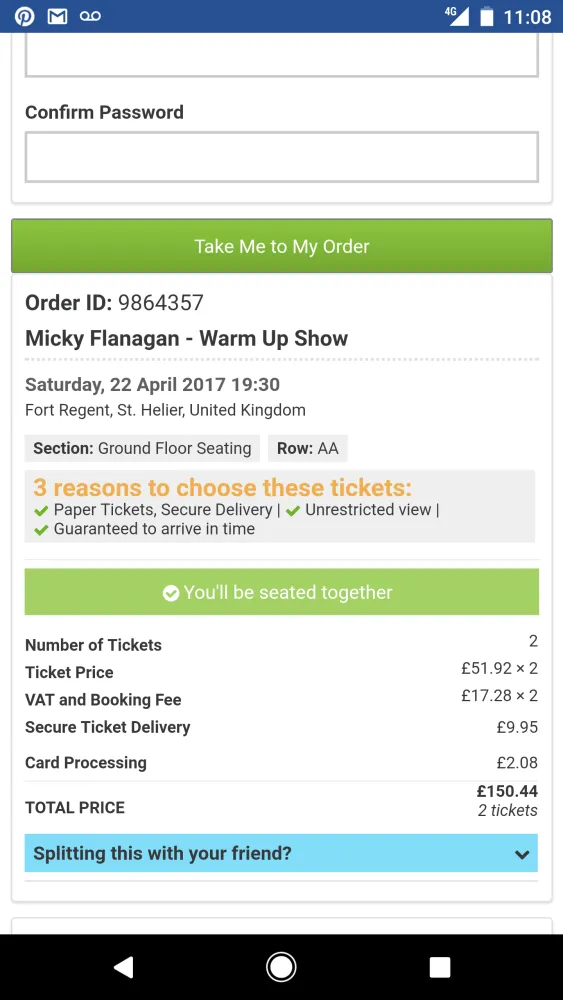 1. These are not together and with juveniles attending we cannot split the party with adult accompaniment – your Viagogo Help Centre states clearly – “Tickets purchased from a single listing will be seated next to each other, unless specifically stated during the check-out process” – this was not stated.