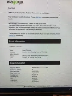 Then several weeks later the tickets became available to print out and I realized that the tickets were only $100.87 (see total price incl GST as printed on the ticket) each and not $132.61 as stated in prior in the viagogo event information/order confirmation.