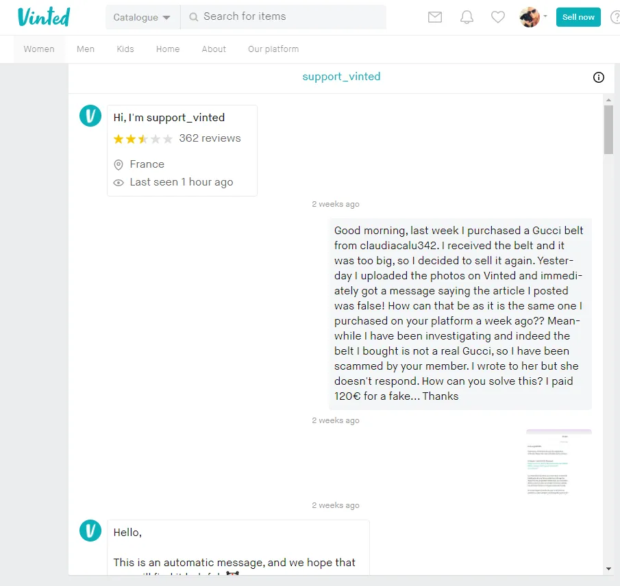 On 15/03 I purchased a Gucci belt on Vinted for the price of 120€ + costs (80€ was paid with the Vinted saldo I had in my account and 49.20€ with Paypal). When the belt arrived I didn't see anything wrong with it, apart from the fact that it was too big for me. I decided to put it back for sale, also on Vinted. Within a minute I received a message, saying the item was fake, and was being removed. I was threatened to be blocked from Vinted if I ever tried to sell a fake item again. Surprising, as they were the ones who sold to me in the first place.