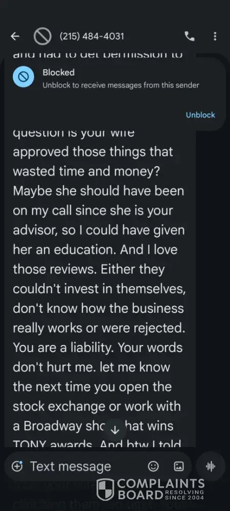 I attended one of her zoom meetings last week. She attacked me and berated me when I said that I wanted to discuss it with my wife before spending any money, which is what any married person should do with his/her spouse when considering spending a few thousand dollars on something. She basically said that I was a wimp and that my wife had my b*lls, which I believe constitutes sexual harassment. She's a vile and disgusting woman. She even texted me to attack me, after which I responded to her letting her know what a vile, disgusting woman she is, and that even if my wife agreed to it and encouraged me to do it, I still wouldn't do business with her, and then I said that since she decided to bring human anatomy into the conversation, I asked which takes up more space--her massive ego, or her fat a**.