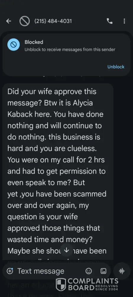 Very unprofessional indeed! I attended her Zoom meeting last week, listening to the same spiel that I imagine you got as well. Did she also play the "Scam or No Scam" game? My first clue was when she mentioned a few companies like Nine9. Having dealt with Nine9 in the past, I found that they were devious scammers, so I wanted to warn the others on the zoom meeting. She panicked and deleted my comment immediately. Why would she have a problem with that? I found out later on. When she started asking for $2,997, I told her that I wanted to discuss it with my spouse first, as any married person would. She began to degrade me, saying that my wife "has my balls." She also degraded my past experiences (I mentioned that I've done a few independent films, among other things, and that I have an agent). She told me to find another hobby, and then booted me off the zoom. Later, I got a text from Deneen, asking me what the #1 thing hit me the hardest during the training session. I texted back, telling her in no uncertain terms that it was the unprofessional and disgusting behavior of Alyica Kaback. Then Alyciak Kaback texted me and continued to degrade me and took cheap shots at me and my wife. I responded to her text letting her know what I thought of her, calling out her disgusting and infantile behavior. I then did research on her and VIP Ignite, and sure enough, I came across many people who had similar experiences, including you. I posted my own reviews on these sites, and I posted one on the Better Business Bureau site. She responded, and made such vile, disgusting lies about me. She accused me of being disruptive and making vulgar comments in the chat box, which I absolutely never did. She accused me of sending her threatening emails when I haven't sent her any emails at all, let alone threatening ones. And she even had the gall to accuse me of threatening to expose my genitalia on the zoom meeting, which I absolutely did NOT do. That is not the kind of person I am! She also claims to have gone to the local authorities about it. But, of course, she has no proof that I did any of that, because it doesn't exist. Because I never did such a thing. I can't believe she would stoop so low as to make such a disgusting accusation about me. She claimed to be concerned about the parents and minors in the zoom meeting. Yet, she had no problem with saying that my wife had my balls in her grip during the zoom meeting. And she accuses ME of being vulgar? If this is how she is with people online, I can only imagine how abusive she is with her poor son and fiancee.