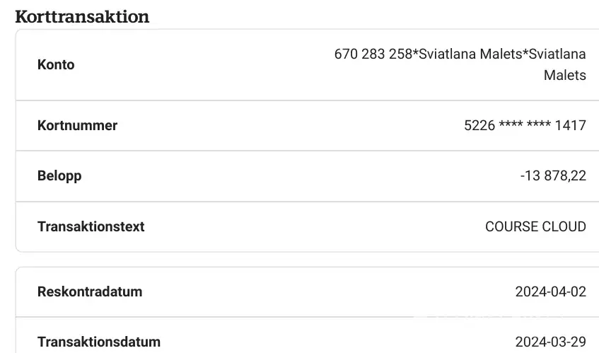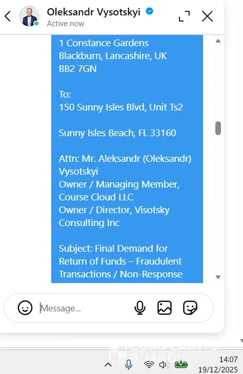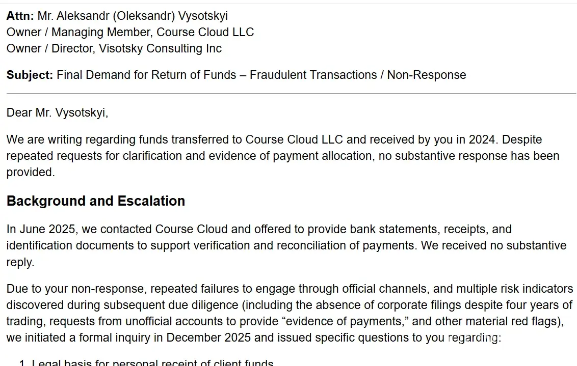 We are a group of victims who, during our independent investigation, discovered that our funds were transferred to Course Cloud LLC (Florida), owned by Oleksandr Yevheniyovych Vysotskyi.