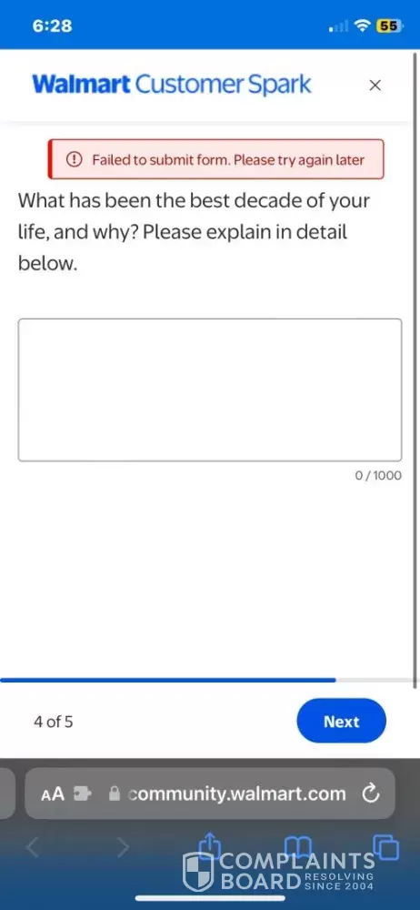On October 5, 2025 I received a email from Walmart Customer Spark Community saying that I have a invitation to there exclusive community where Walmart customers who can participate in fun and engaging survey activities to earn Walmart eGift Cards. Since this was only available for a few days I clicked on the get started button on the email so I don’t miss out on the opportunity then I was taken to the Walmart Customer Spark Website. after I completed the 4 pages I was finally on the last page where all I had to do is fill out a survey about what has been the best decade of my life and why in detail. Once I have finished the survey I clicked the Next button then I received an Error saying “failed to submit form”. “Please try again later” Multiple Times (As Shown in the Picture)