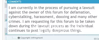 Seems like there is no real legal help or information here. They don't help anyone. If you post a comment once in a while a little helpful. Not much this forum offers. Seems like a bunch of old farts that sit behind a computer and act tough and smart. Nothing has really been a learning experience at this forum. Sister websites like thelaw.com, forum...
