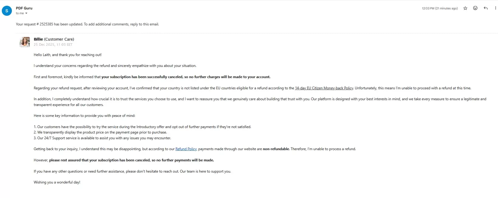 I am writing to report a fraudulent charge from pdfguru.com. I am a student and I just wanted to edit one single file. They made it look like a cheap trial but then they secretly charged my card $49.99 for a full year without any clear warning or confirmation. To make things worse, they actually blocked my access to the account for 2 days right after the...