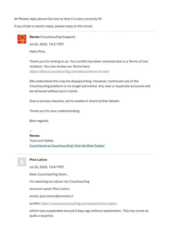 My account was suspended on July 18, 2025 without any explanation, a circumstance that came as a profound surprise to me, considering that in three years of active and positive participation in the Couchsurfing community I have always fully respected and accepted the Terms of Use, receiving over 129 positive references. I politely requested to be informed...