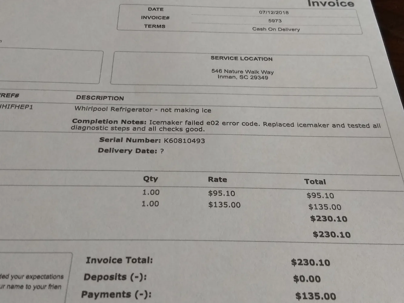 Product was purchased in Oct 2016 and the Ice Maker died in June 2018. When it was first used, it made a strange noise while making Ice but because we had never had a Whirlpool refrigerator before, we assumed it was normal. After the second Ice Maker was installed and DIDN'T WORK, I felt there was a problem with your Ice Makers. Now that the new ice maker is installed there is NO noise and make me believe the Ice Maker was defective from the get go and I should be reimbursed for the $135.00 labor I was charged.. Ed Duffy, 546 Nature Walk Way Inman SC [protected]