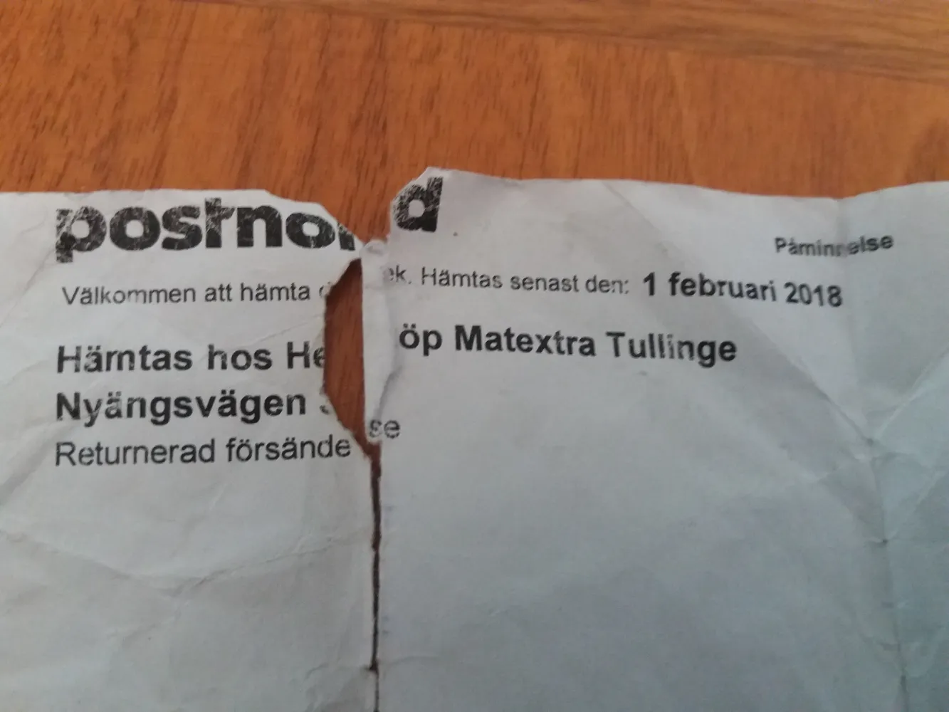 They were sent to my local postoffice at "Matextra" in Tullinge the 10 of october but was returned to Postnord on the 21 of november . Then "Matextra" sent them back to Postnord and I went to pick it up again around the 20th of january . It said on the envelope that the package was going to be there until the 1 of february, so this time I wasn´t late, but still they had sent them back. And they ask me to contact you now .
