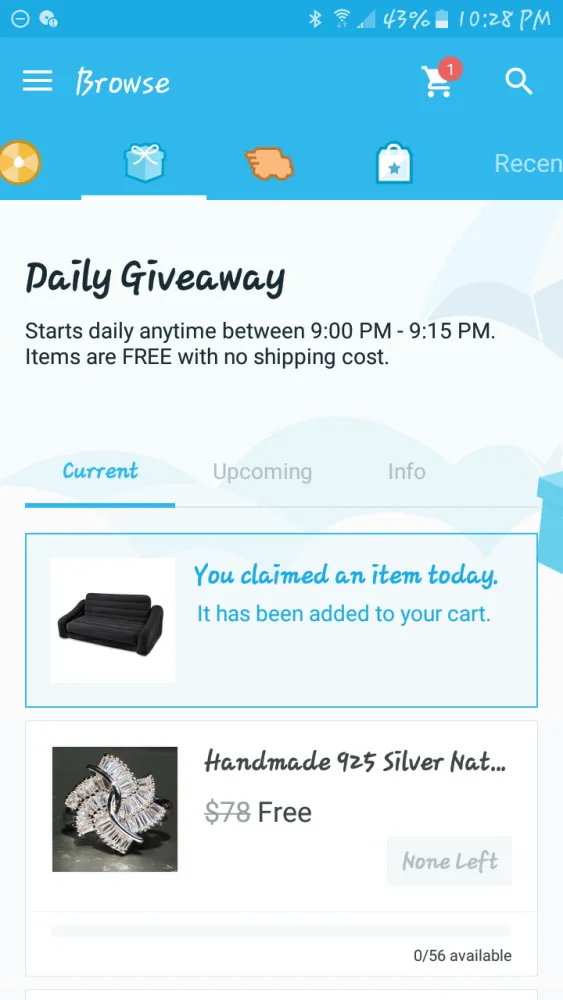 3. Strategy, strategy, Strategy. You don't have to get out of the page and get back in to refresh, just click on current to refresh. Before the giveaway, click on current to test how long it takes your device to reload. If it takes 3 seconds to reload, click current 2 to 2.5 seconds before the top of the minute. That way you reload as the top of the minute starts. The giveaway will always start at the top of the minute. If you wait for the notification to pop up saying it starts, you're to late, everything is gone. Most items are gone within the first 3 seconds. You have to be faster claiming items then the millions of people your trying to out click!. If you load to late, go for the items that have more available. Know your options and 2nd choices before the giveaway starts. If you miss the first item you went for, reload (click current) again, try again. If you load to late again the 2nd time, you're out of luck, if you load to early, try reloading (clicking current) again.